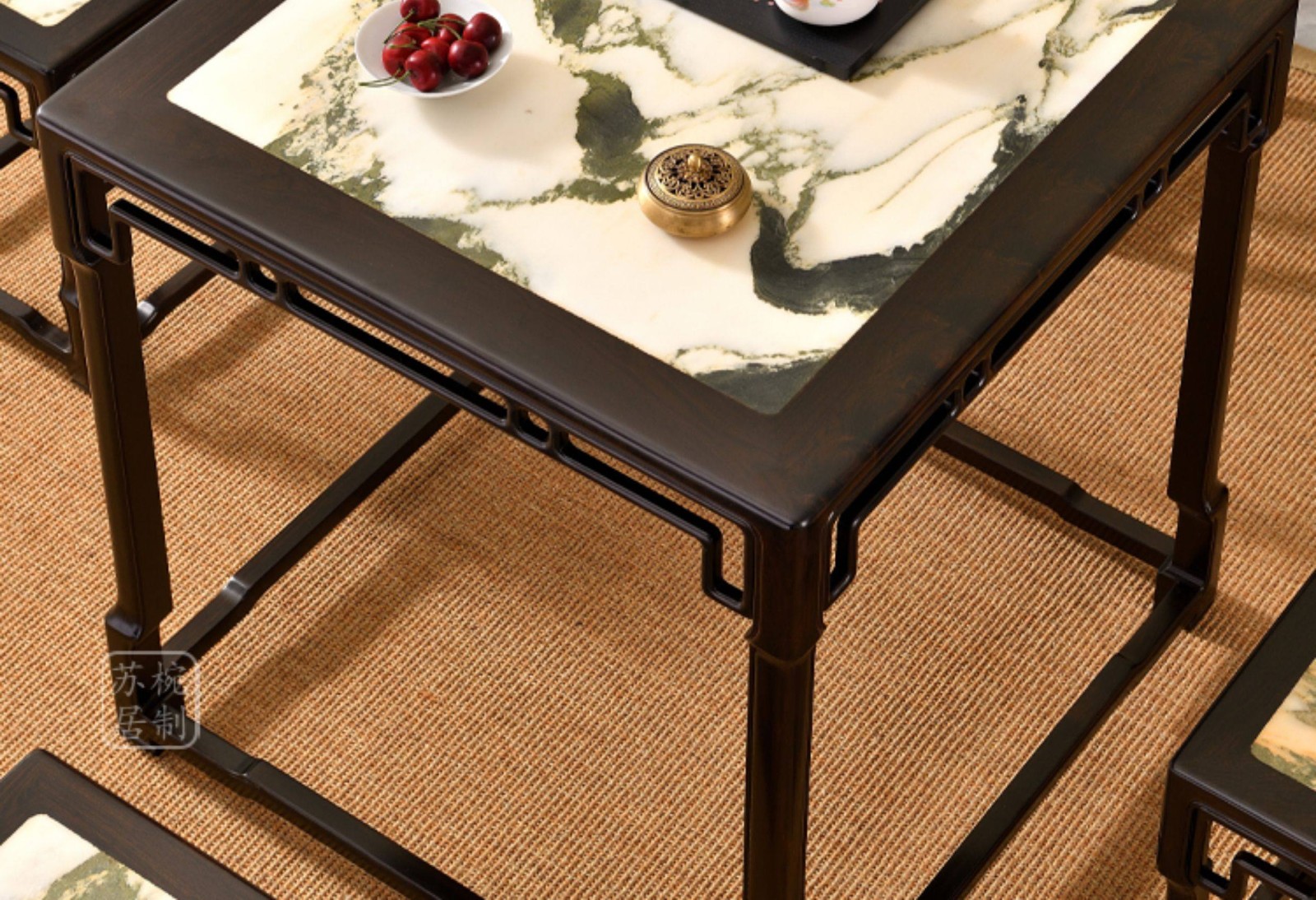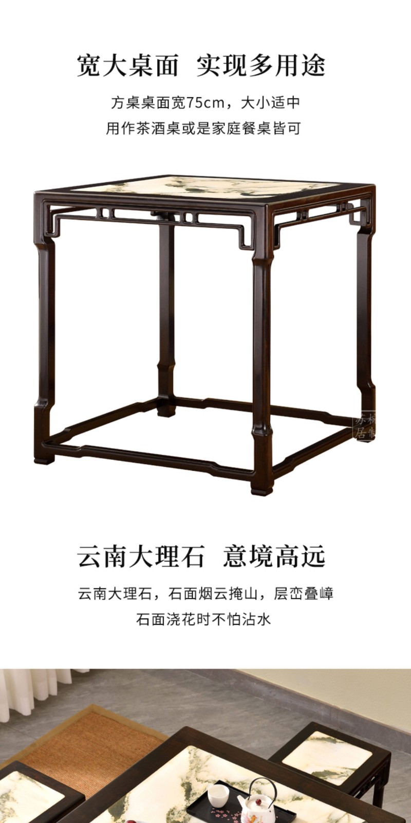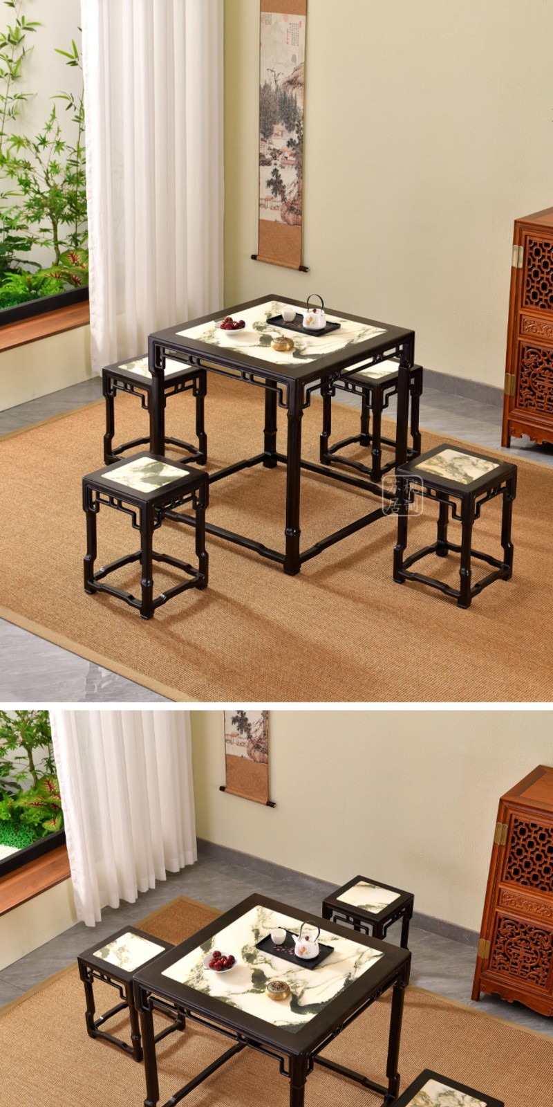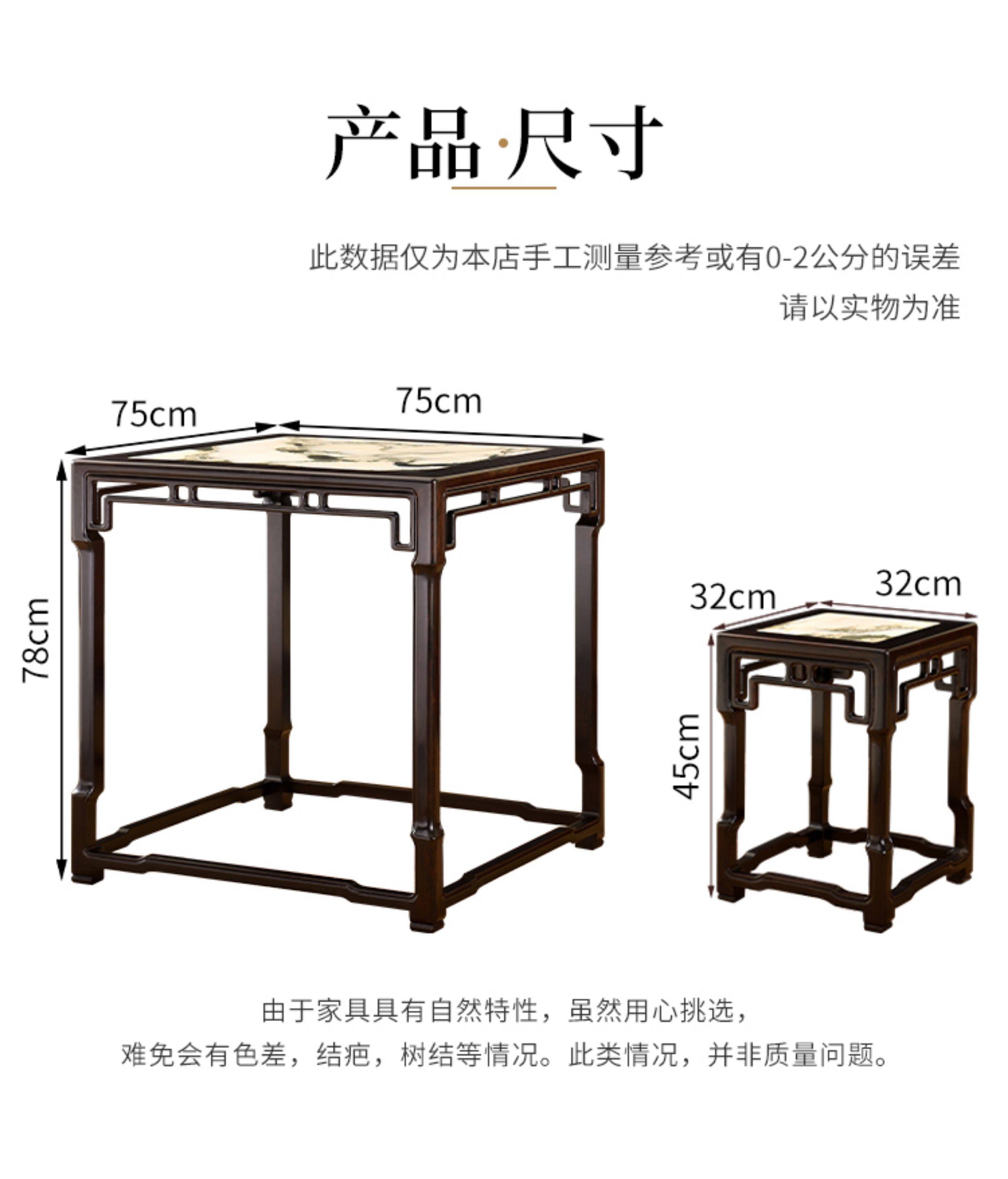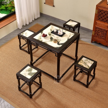 紫光檀云石面四方桌红木新中式家具正方形茶桌一桌四凳