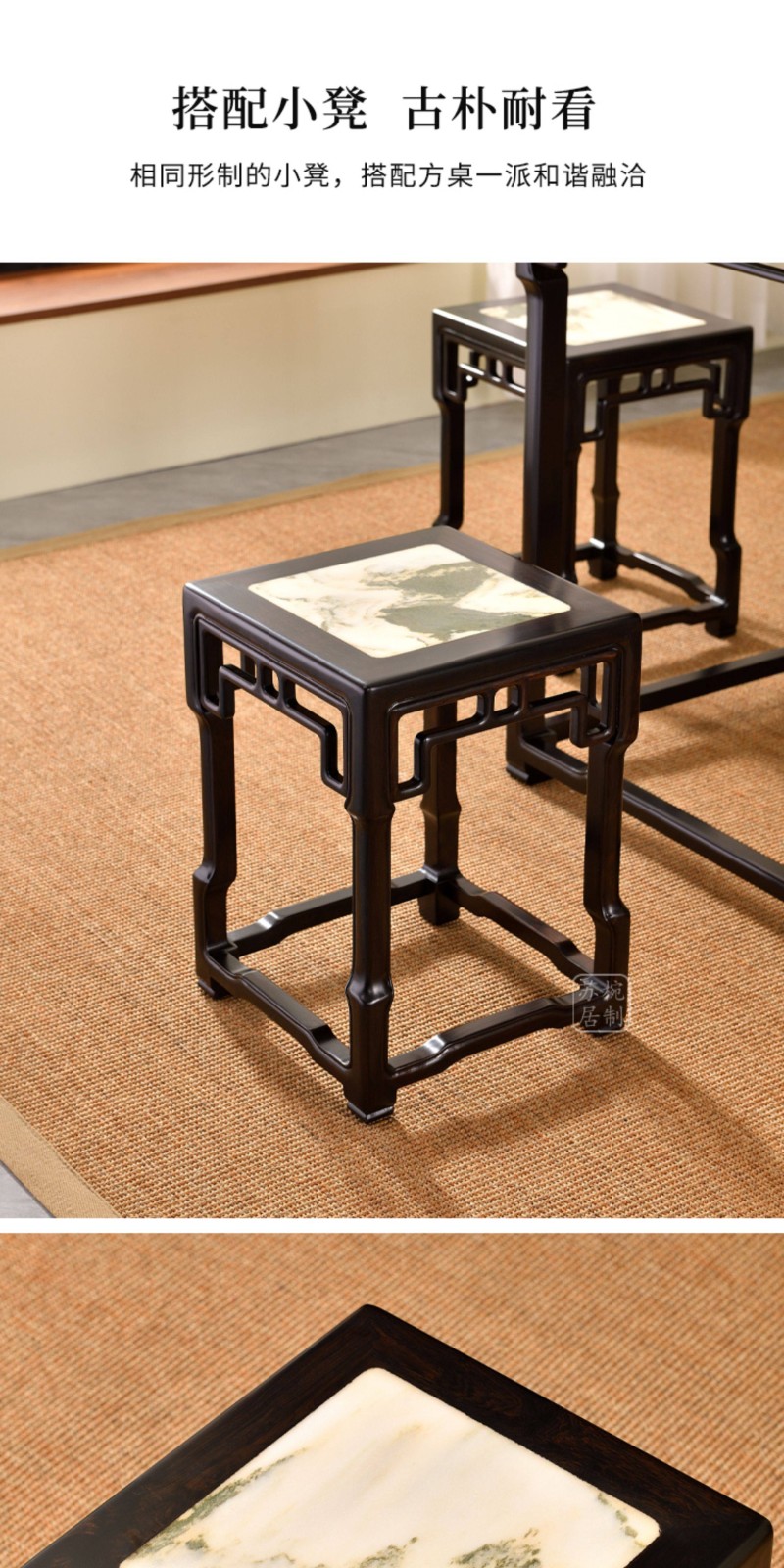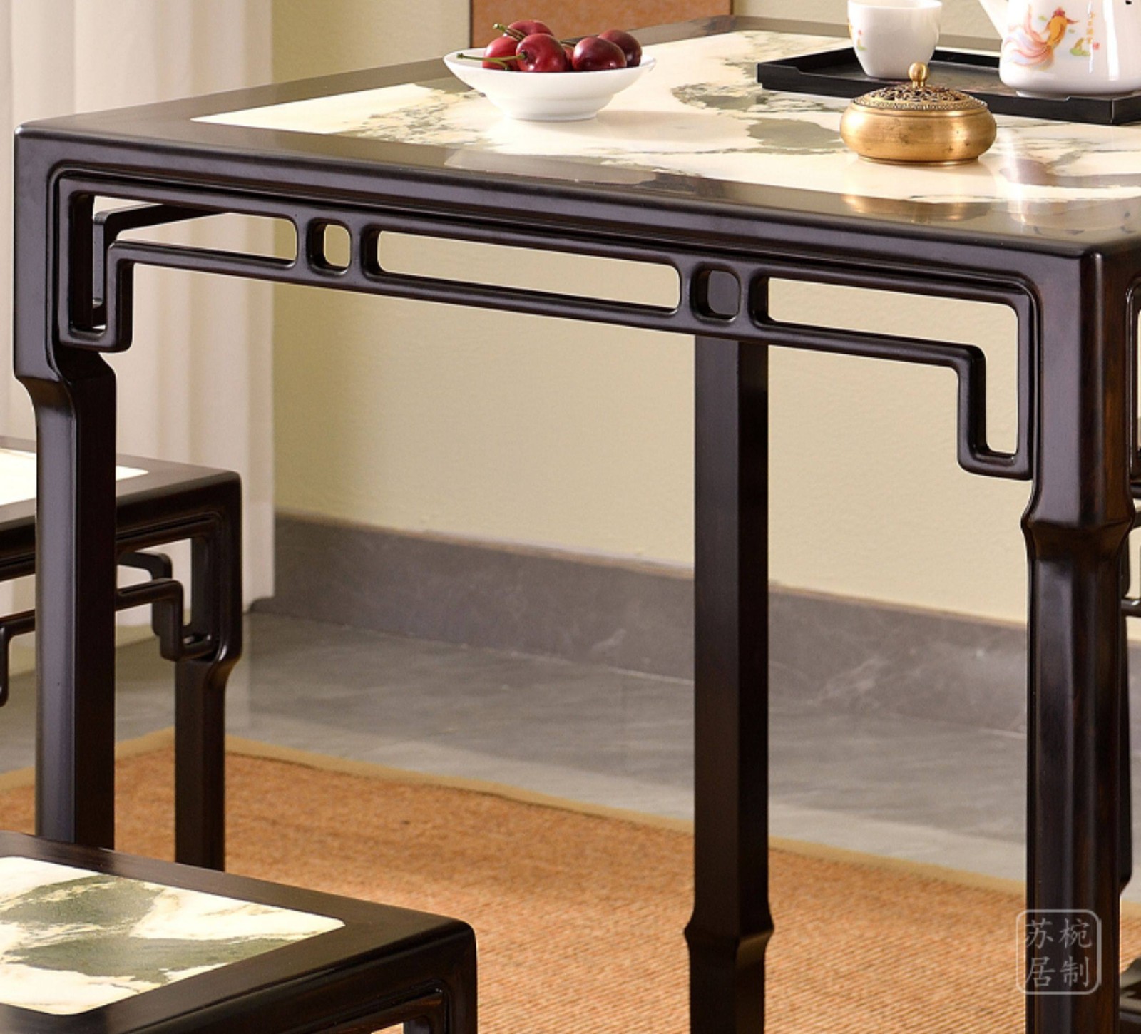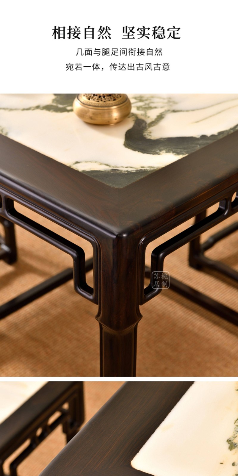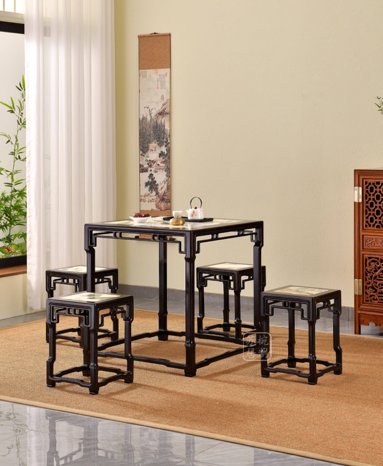 紫光檀云石面四方桌红木新中式家具正方形茶桌一桌四凳